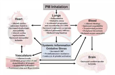顆粒物的大小決定了它們最終在呼吸道中的位置,較大的顆粒物往往被纖毛和黏液過濾,無法通過鼻子和咽喉。但是,小于10微米的可吸入顆粒物(PM10),可以穿透這些屏障到達(dá)支氣管和肺泡。而小于2.5μm的細(xì)顆粒物(PM2.5),更容易吸附有毒害的物質(zhì),如一些重金屬鉛、鋅、砷、鎘等,由于體積小,PM2.5具有更強(qiáng)的穿透力,可直接抵達(dá)細(xì)支氣管壁,并干擾肺內(nèi)的氣體交換。更小的微粒(直徑小于等于100納米,0.1微米)會通過肺部傳遞影響其他器官。PM由肺然后到其他器官的影響,可以參考下面這張圖(*1-參考資料來源,參見文末)。