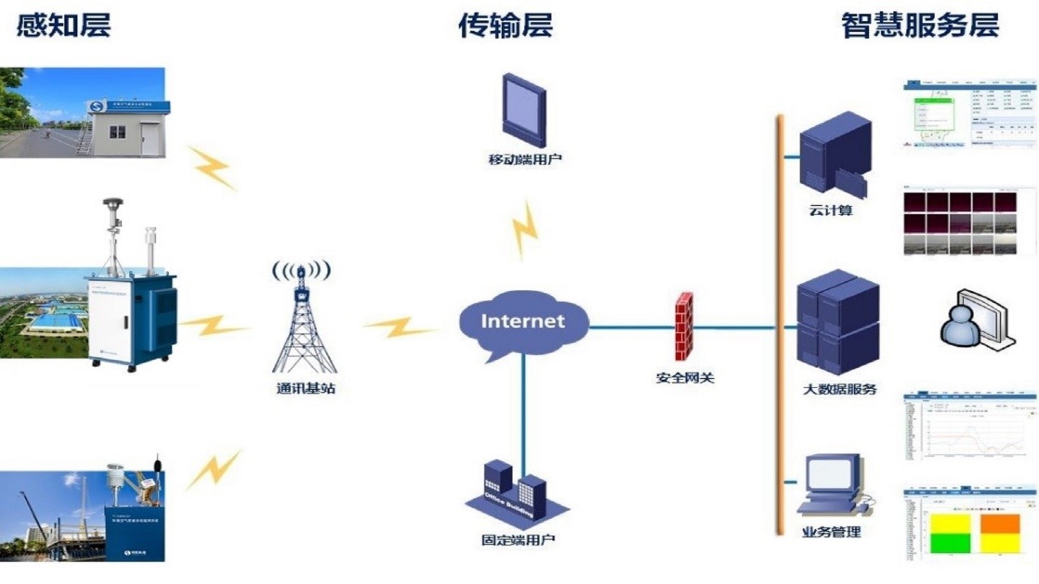 以自動化監測儀器為數據監測、存儲、上傳的載體,通過在環保主管部門建設數據中心、部署軟件應用系統,利用已建或新建網絡,各職責部門可通過手機、電腦終端等方式應用監測數據,從而實現對環境空氣質量的采集、分析、應用和決策。