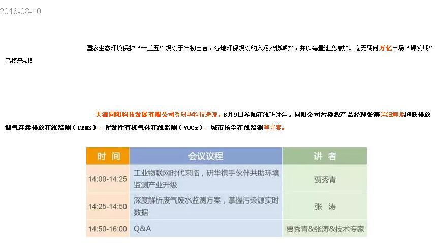 【環保十三五】天津同陽科技受邀參加環保行業在線研討會 更新時間:2016-08-05 點擊:20933 所屬欄目:公司新聞 Update Time:2016-08-05 Hits:20933 Belong Column:News 【環保十三五】天津同陽科技受邀參加環保行業在線研討會