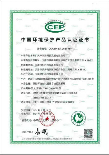 2021年5月,中環(huán)協(xié)(北京)認證中心實施了新版認證技術(shù)規(guī)范——《網(wǎng)格化環(huán)境空氣質(zhì)量監(jiān)測儀認證技術(shù)規(guī)范》(RJGF008-2021),天津同陽科技發(fā)展有限公司的微型環(huán)境空氣質(zhì)量自動監(jiān)測系統(tǒng)在經(jīng)過“產(chǎn)品檢驗+工廠(現(xiàn)場)條件審查”后,順利通過中國環(huán)境保護產(chǎn)品認證工作,獲得了由中國環(huán)境保護產(chǎn)業(yè)協(xié)會頒發(fā)的CCEP中國環(huán)境保護產(chǎn)品認證證書(證書編號:CCAEPI-EP-2021-497)。同陽科技是首批通過新版認證技術(shù)規(guī)范并取得CCEP證書的企業(yè)。
