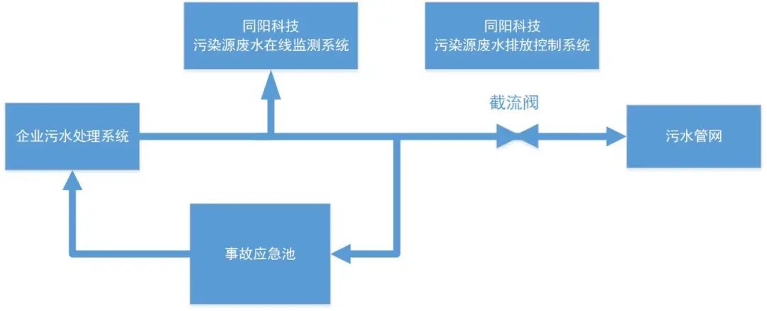 針對這個實際需求,同陽科技提供了廢水排放監管解決方案。該方案在企業廢水排放口末端安裝電控截流閥,根據廢水水質在線數據,水質一旦超標,系統會聯動電控截流閥切斷原排污管路,將超標廢水導入事故應急池中,避免超標廢水流入污水管網。待企業排放的廢水檢測達標后方可向環保部門申請向污水管網內排污,將污染問題消除在萌芽階段,符合環保初衷。