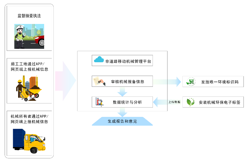 非道路移動機(jī)械種類繁多,應(yīng)用廣泛,相對于機(jī)動車而言,存在底數(shù)不清、污染控制技術(shù)水平相對落后、污染物排放量大等問題。因此非道路移動機(jī)械監(jiān)管需要通過機(jī)械信息摸底調(diào)查、環(huán)保編碼上牌及安裝電子標(biāo)簽和在線尾氣傳感器、監(jiān)督抽查執(zhí)法的三步走來實(shí)現(xiàn)全方位監(jiān)管。