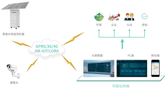 黑臭水體在線自動監測系統基于物聯網的理念,采用信息化手段,結合GIS展示,通過建立微型水站的方式實現對黑臭水體水質、環境因素等的實時監測,通過專用的通訊系統,將監測數據上傳至遠程的監控中心和托管站,從而實現遠程監控的功能,建立長效的監督管理機制,動態展示黑臭水體治理成果,最終達到提升人居環境質量,改善城市生態環境的目的。