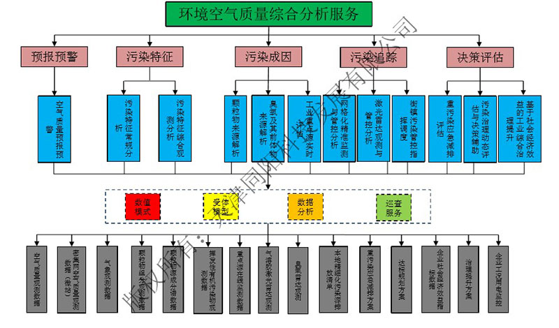 總體架構分為業(yè)務層、工具層和數據層。業(yè)務層指通過綜合基礎數據、工具和專業(yè)知識而形成的,為用戶解決特定需求的一系列事務、活動和方法集合,公司將各種基于科學研究的分析以標準化的方案和流程,形成業(yè)務化的服務項目,包括預警預報、污染特征、污染成因、污染追蹤和決策評估5類數據分析服務業(yè)務。工具層是指在數據分析業(yè)務過程中需要利用的技術和服務工具與模式,主要包括數值模式、受體模型、人工數據分析和巡查服務。基礎數據指整個分析服務過程中使用的所有數據,包括空氣質量觀測數據、氣象觀測數據、顆粒物成分譜數據、揮發(fā)性有機物組分數據等十三大類。